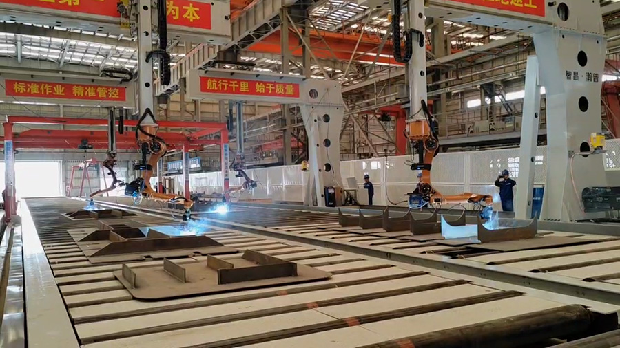 智能物流系統(tǒng):配置智能RGV與桁車組成地面物流網(wǎng)絡(luò),實(shí)現(xiàn)筋板、肋板與底板的自動化輸送;采用力感伸縮仿手翻板機(jī)完成大尺寸底板的安全高效翻轉(zhuǎn)。